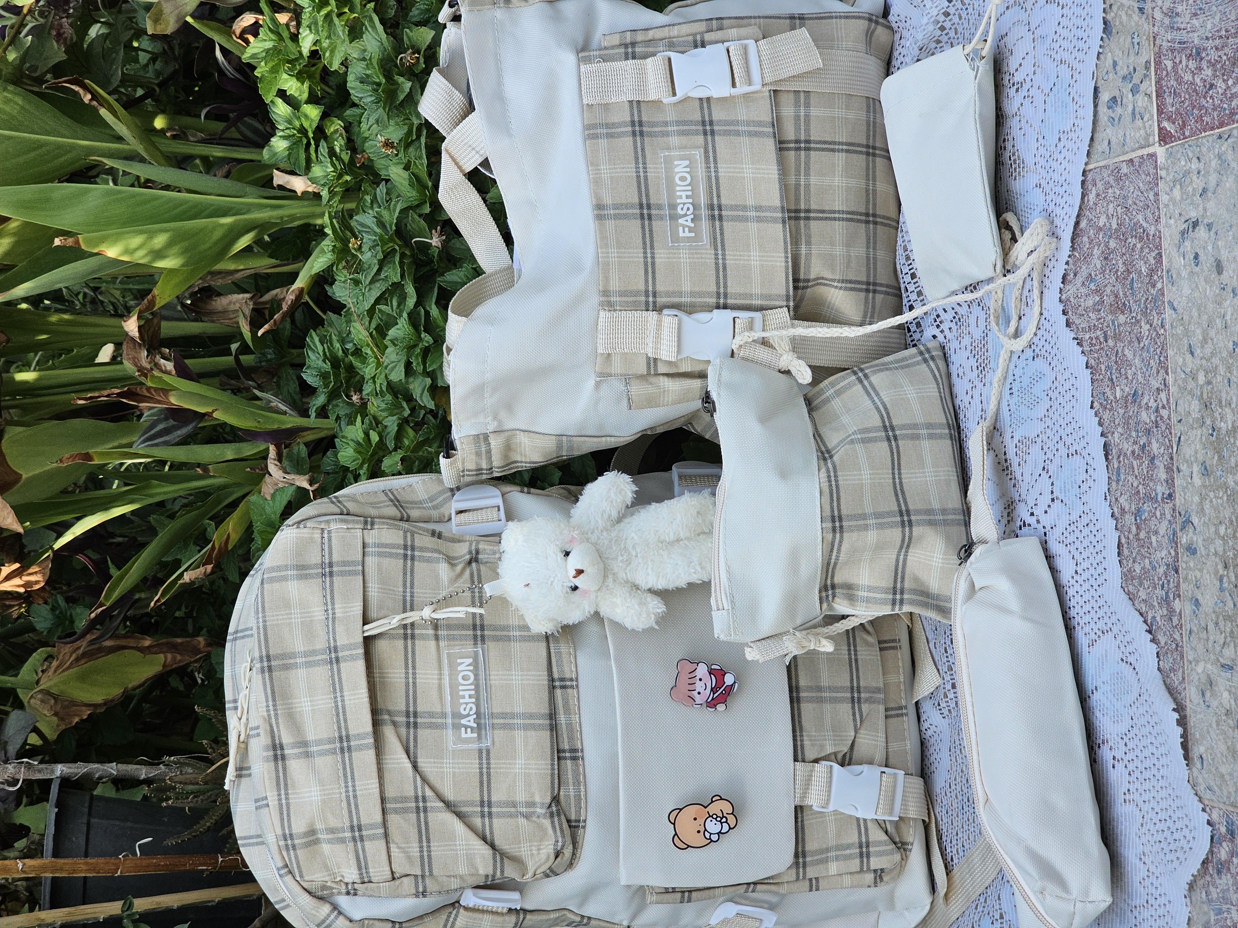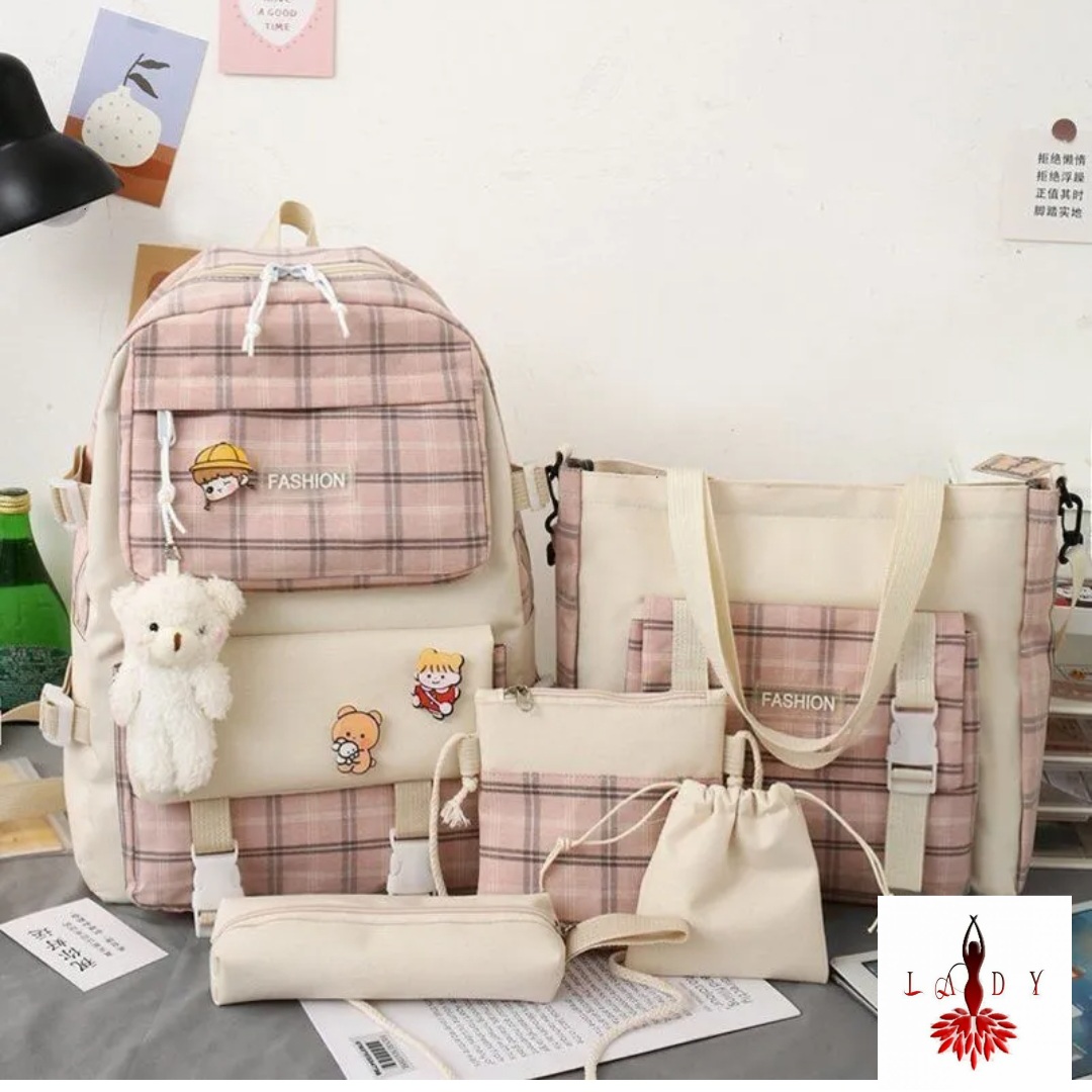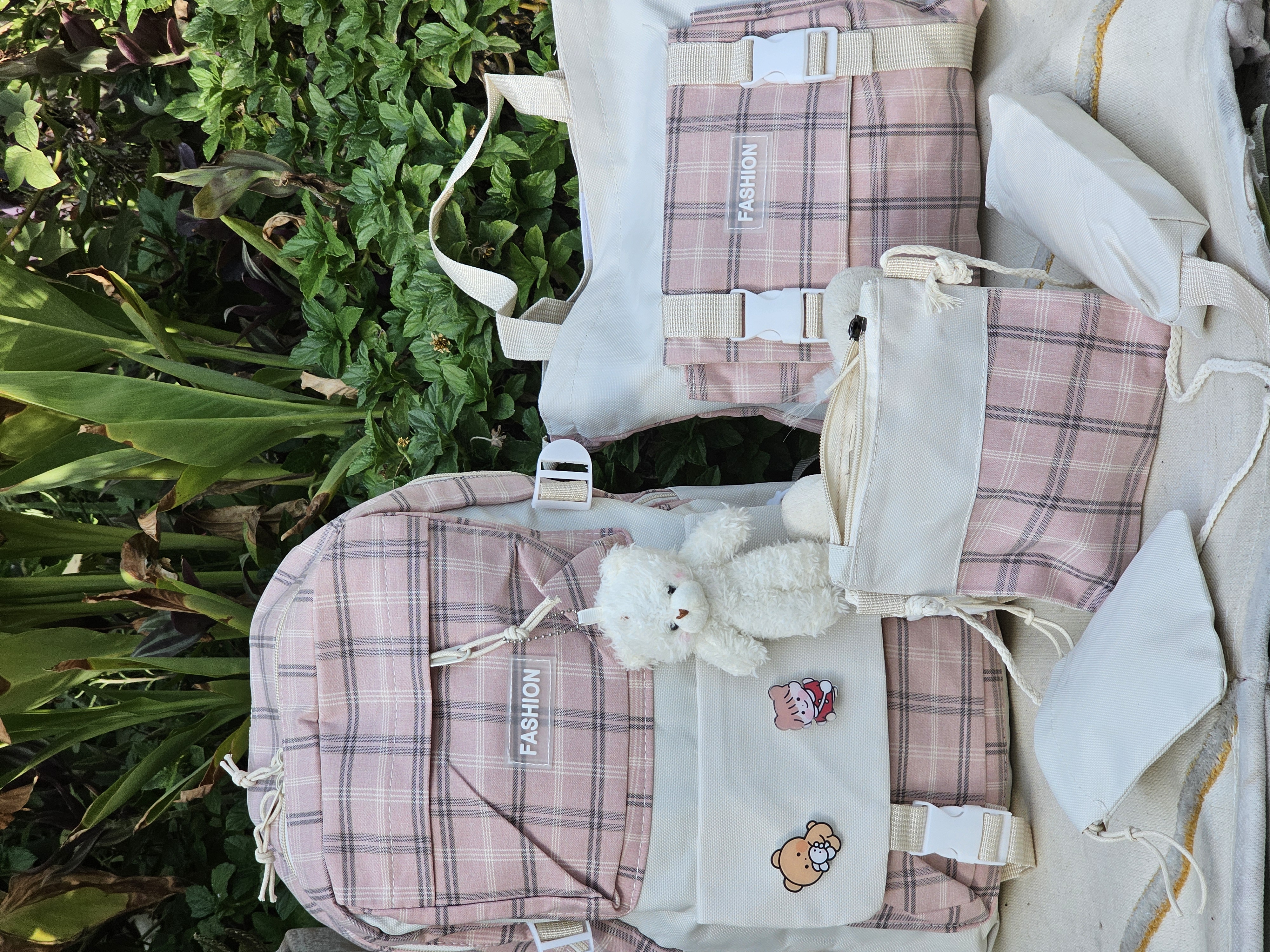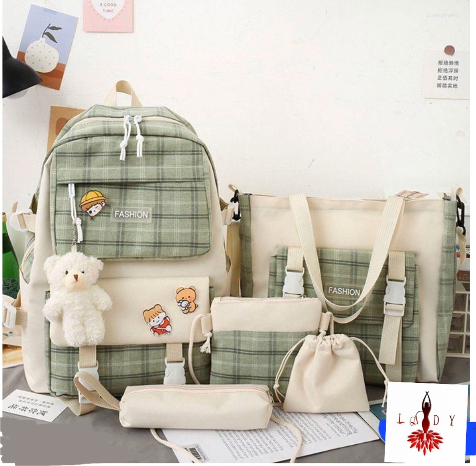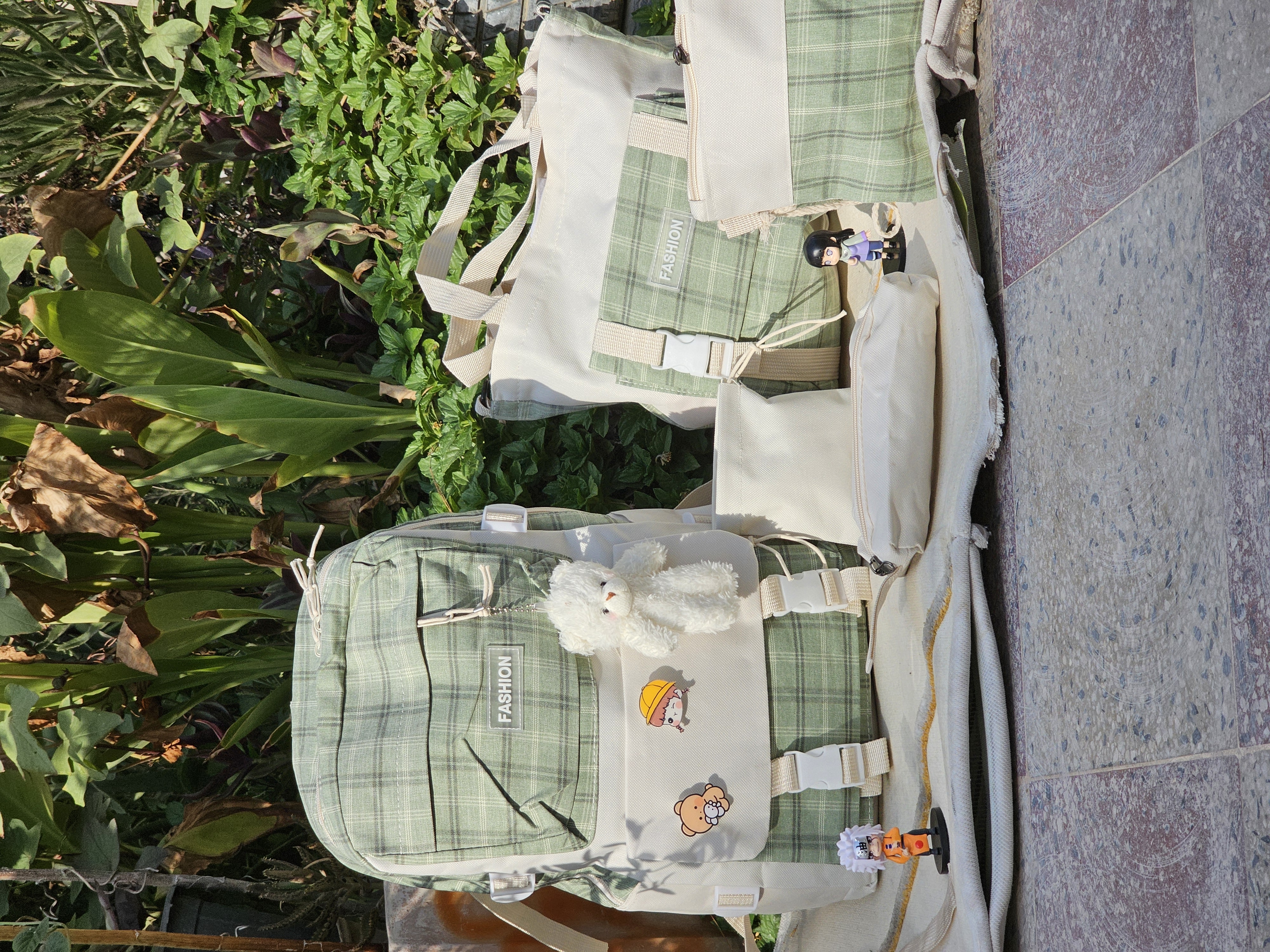 ست پنج تیکه شامل کوله وساک دستی وجامدادی و کیف متوسط بند دار و کیف کوچک رنگ بندی مختلف متریال پلی استر یا کناف کوله تمام استر دسته بندی محکمجادار مناسب مدارس و دانشگاه و سایر استفاده ابعاد 15*30*44همرا با پیکسل وخرس